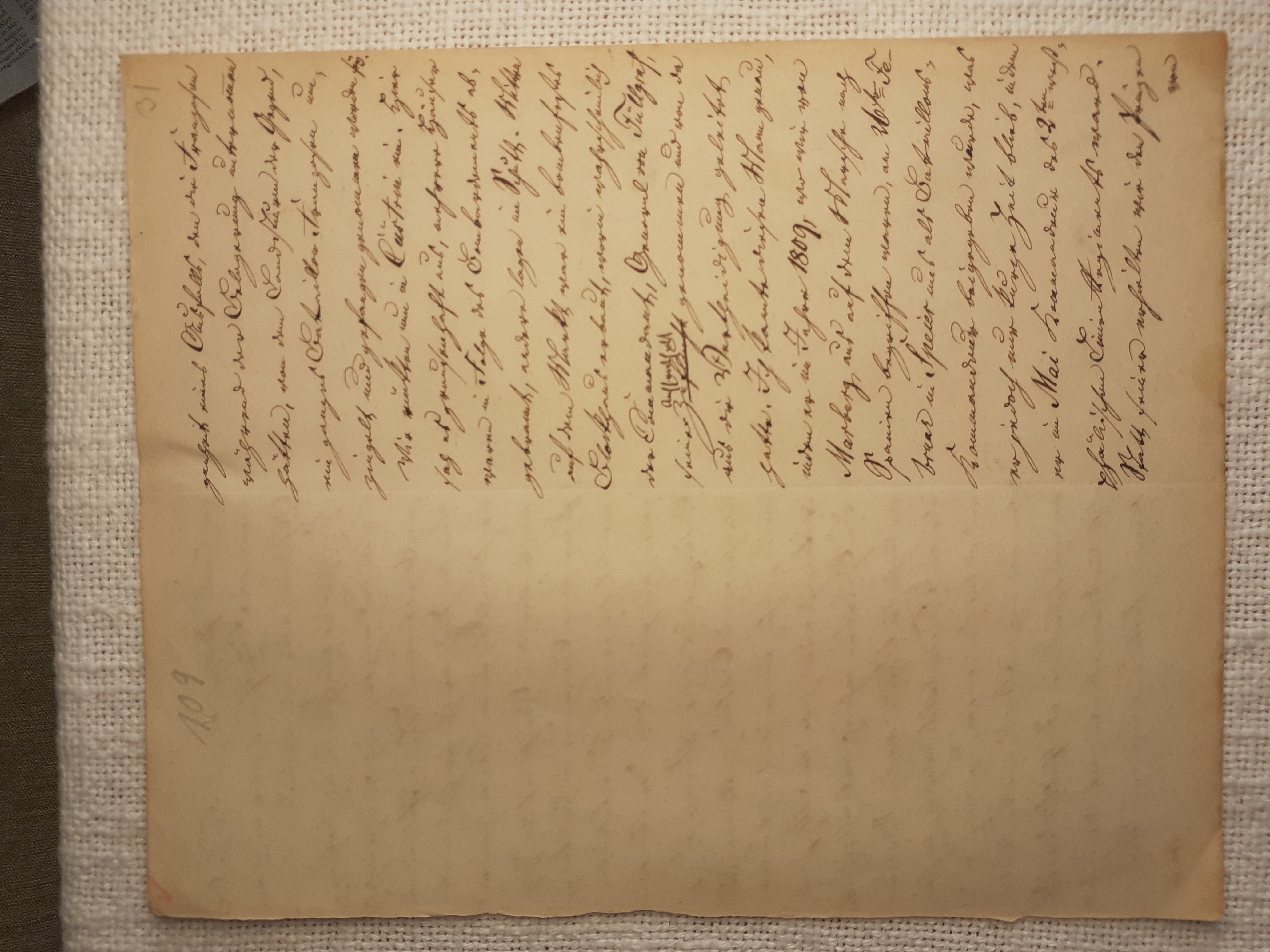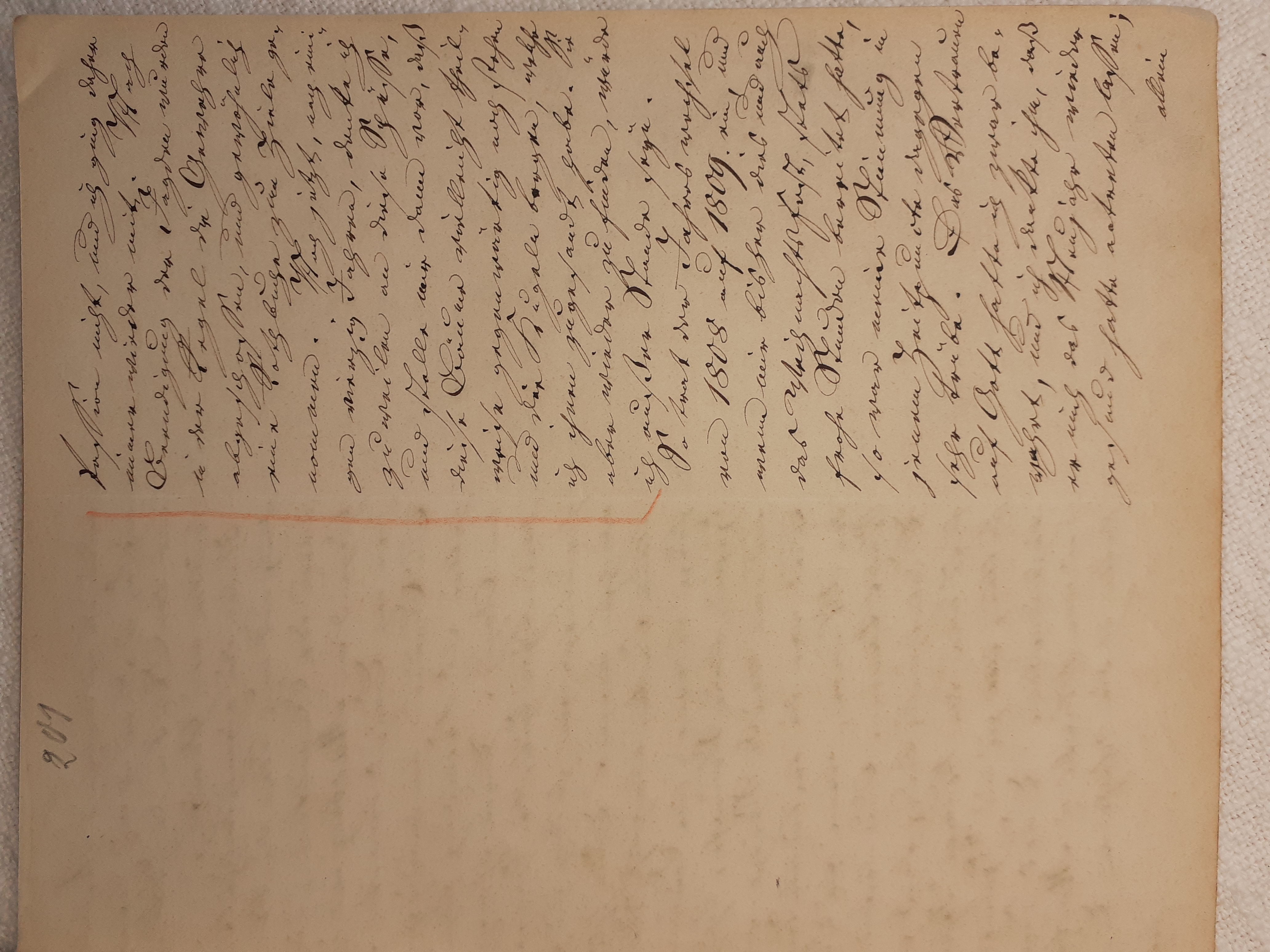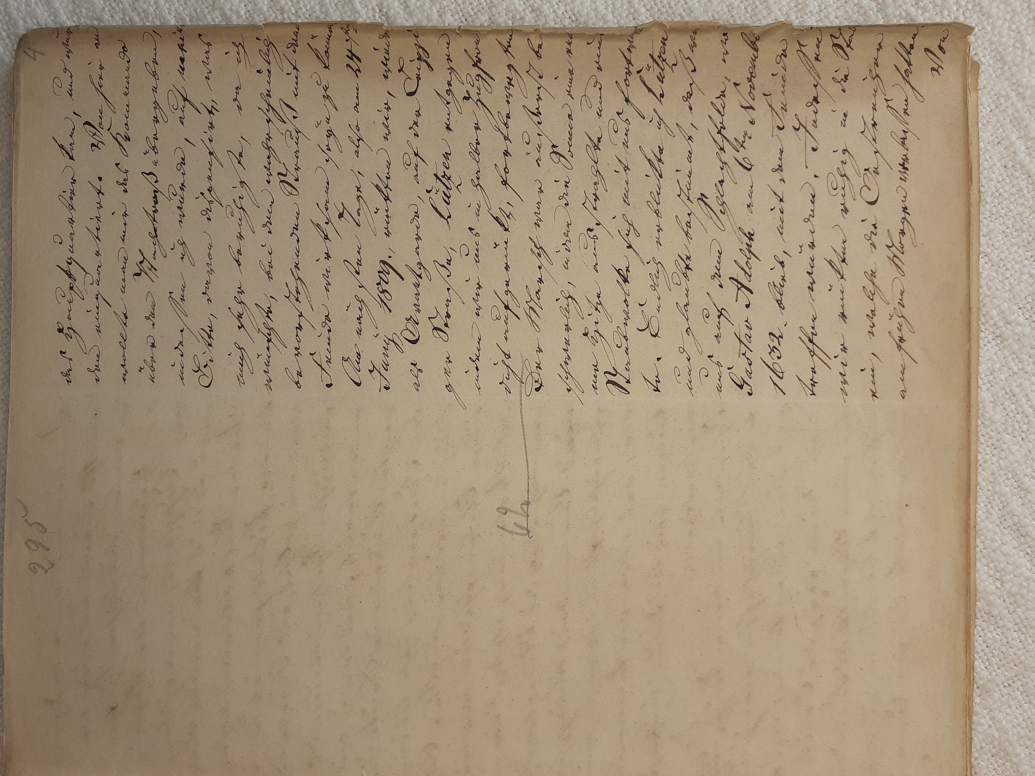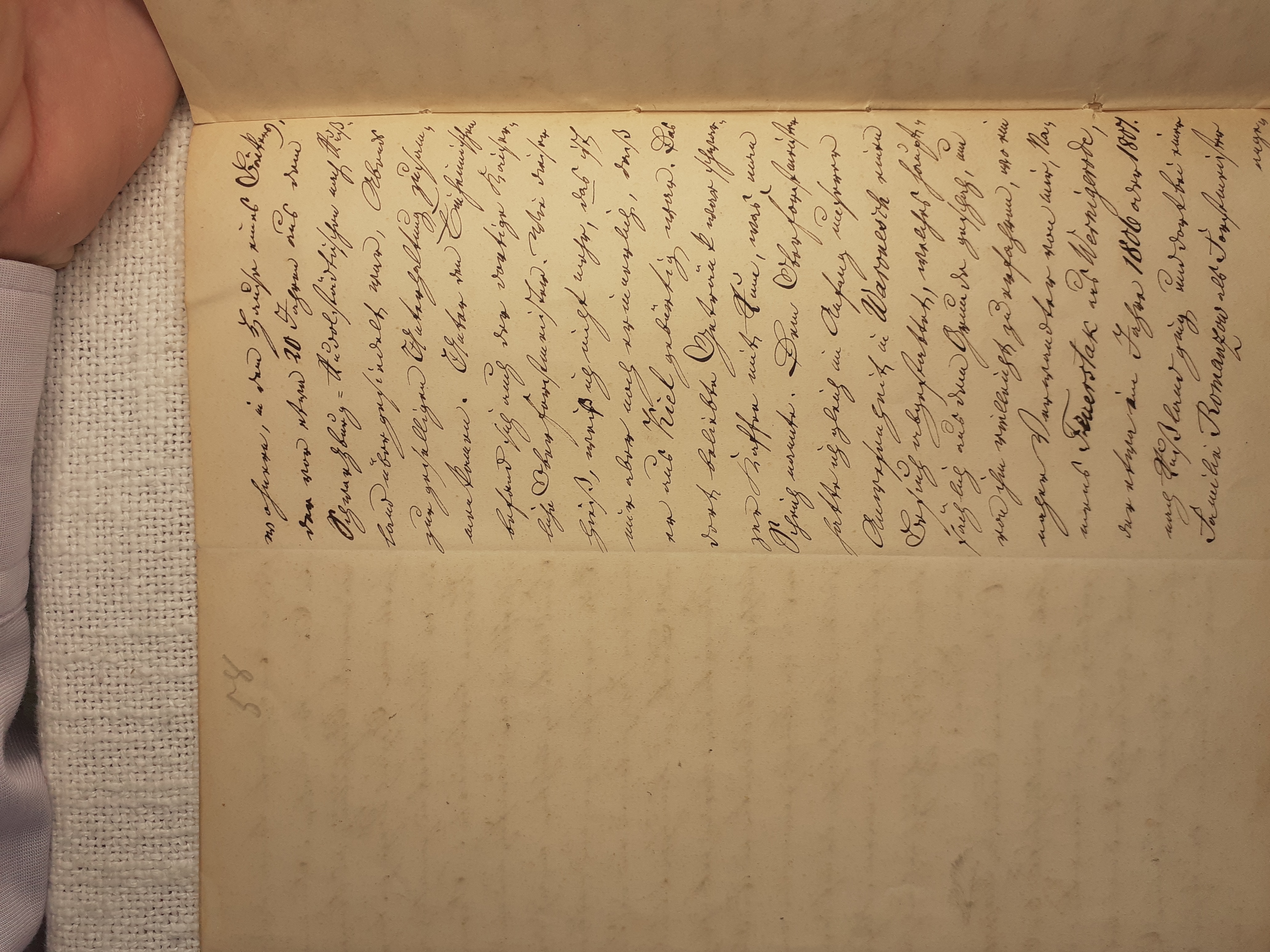 mit herein zu fahren. Der Knecht mähte und wir nahmen hinter ihm das Futter auf. Unvorsichtig kam ich dem Mäher zu nah und er hieb mir mit der Sense die Wade des rechten Beins bis auf den Knochen durch, so daß man die Sense auf dem Knochen durch streifen hörte. Freilich stimmte ich hierbei ein Klagelied an, indessen faßte mich das Mädchen und trug mich nach Hause, wobei viel Blut verloren ging. Meine Mutter, die allerlei Hausmittel anzuwenden verstand, auch immer einen kleinen Vorrath von Pflastern etc. bereit hielt, reinigte die Wunde, stillte das Blut und verband solche mit Scharpie und Degestin4. Später verband ich sie selbst und der Schaden würde sehr bald geheilt worden seyn, wenn ich mehr darauf Bedacht gewesen wäre, Stöße, Schläge etc. davon abzuwenden. Das Merkmal von der Wunde ist