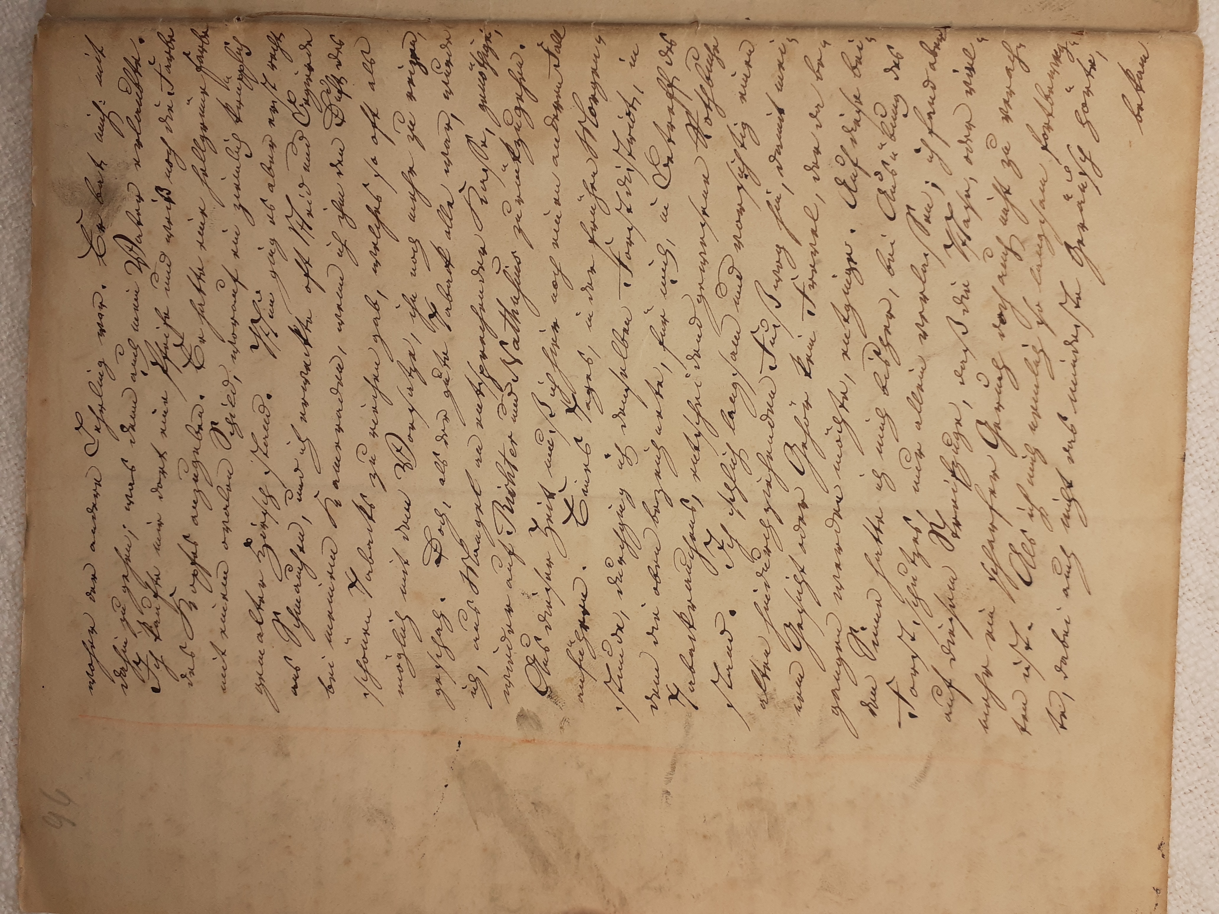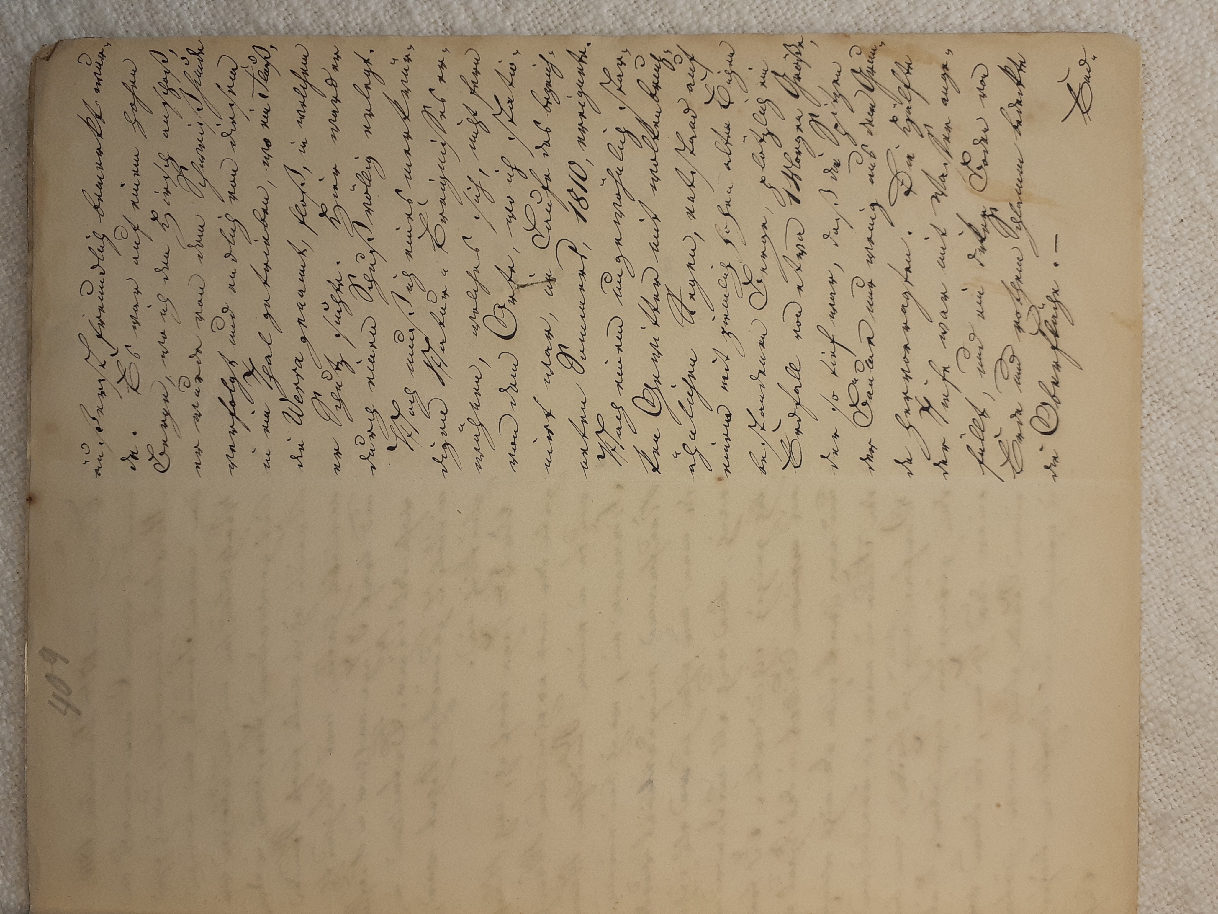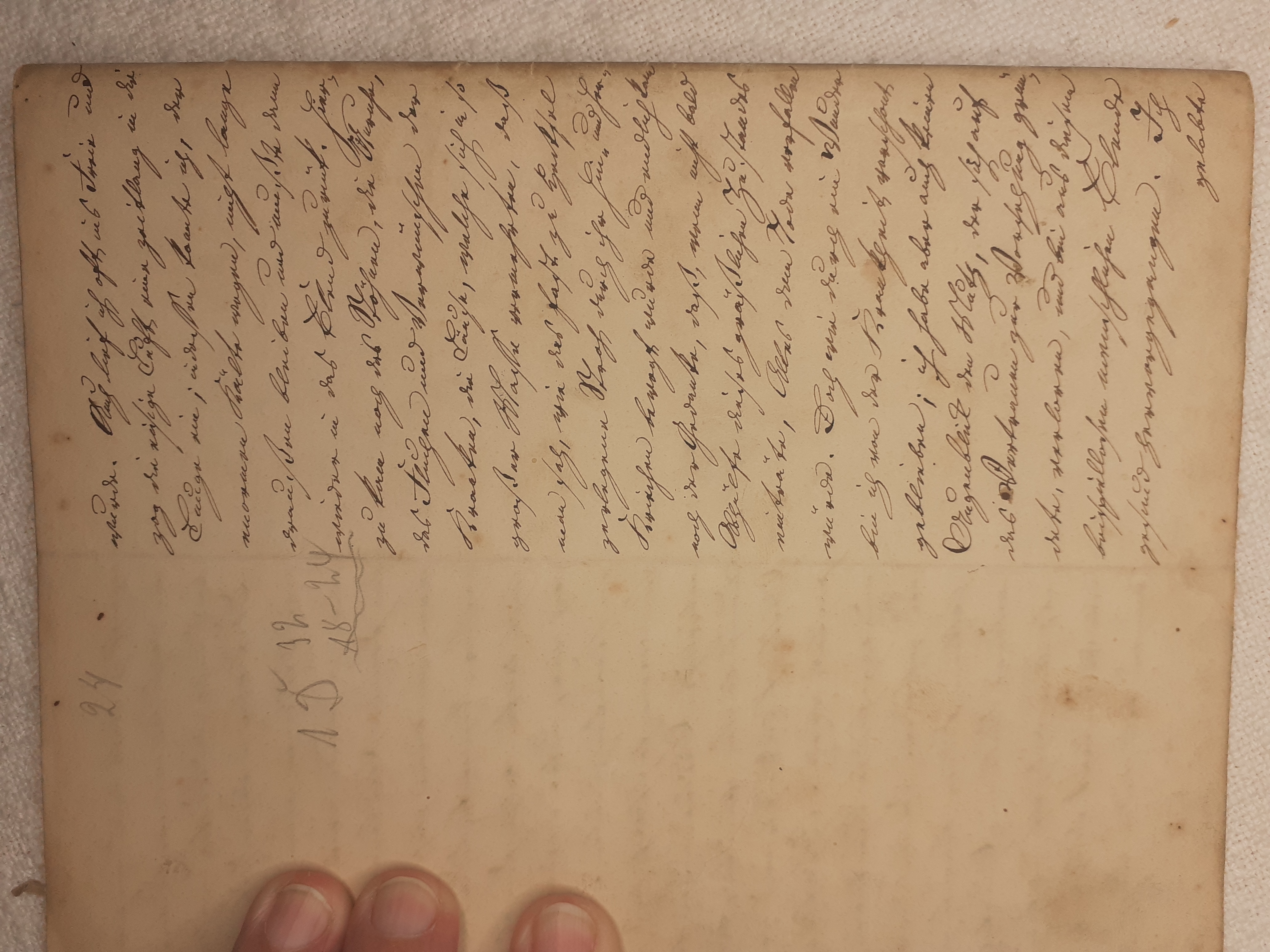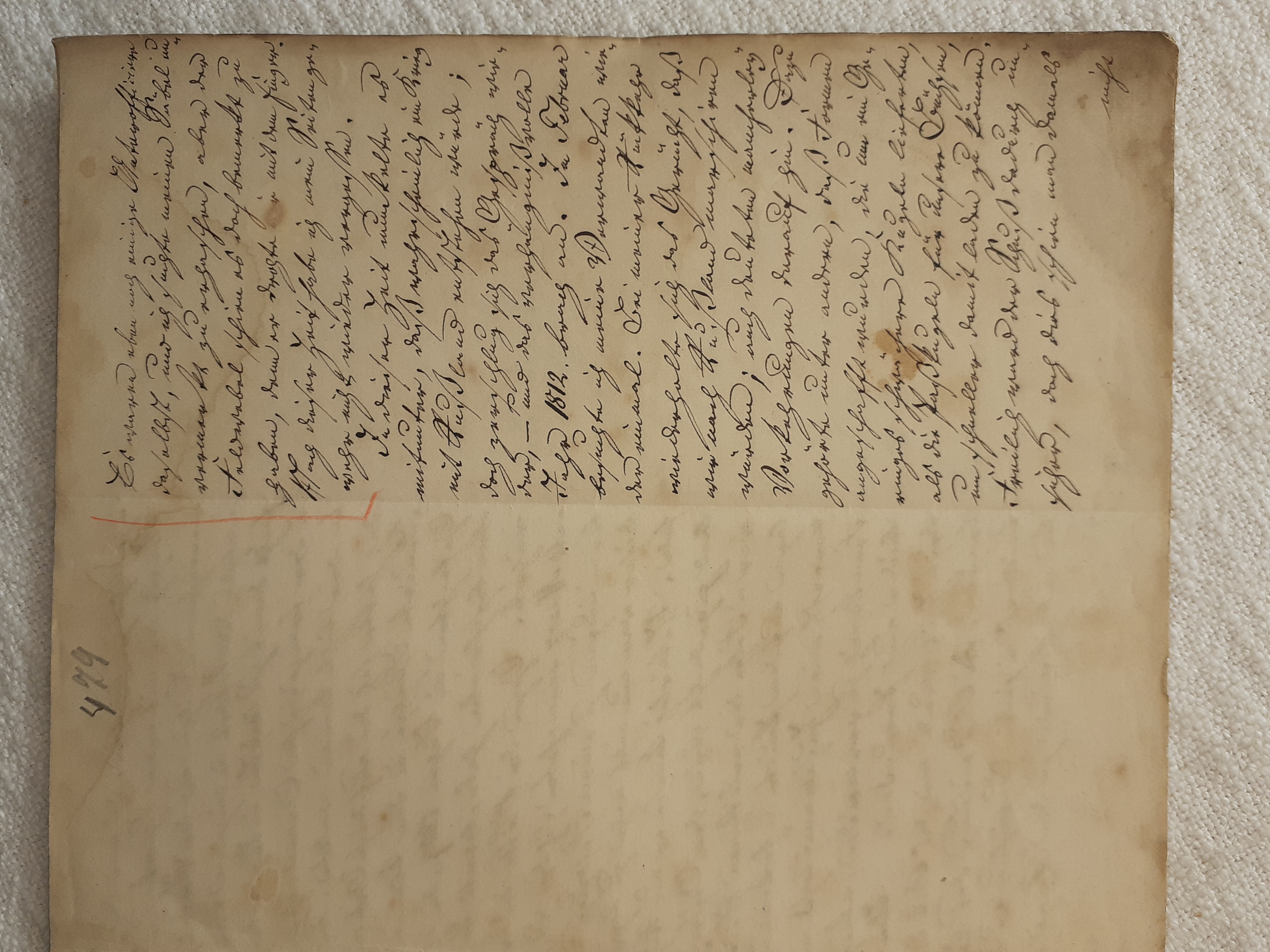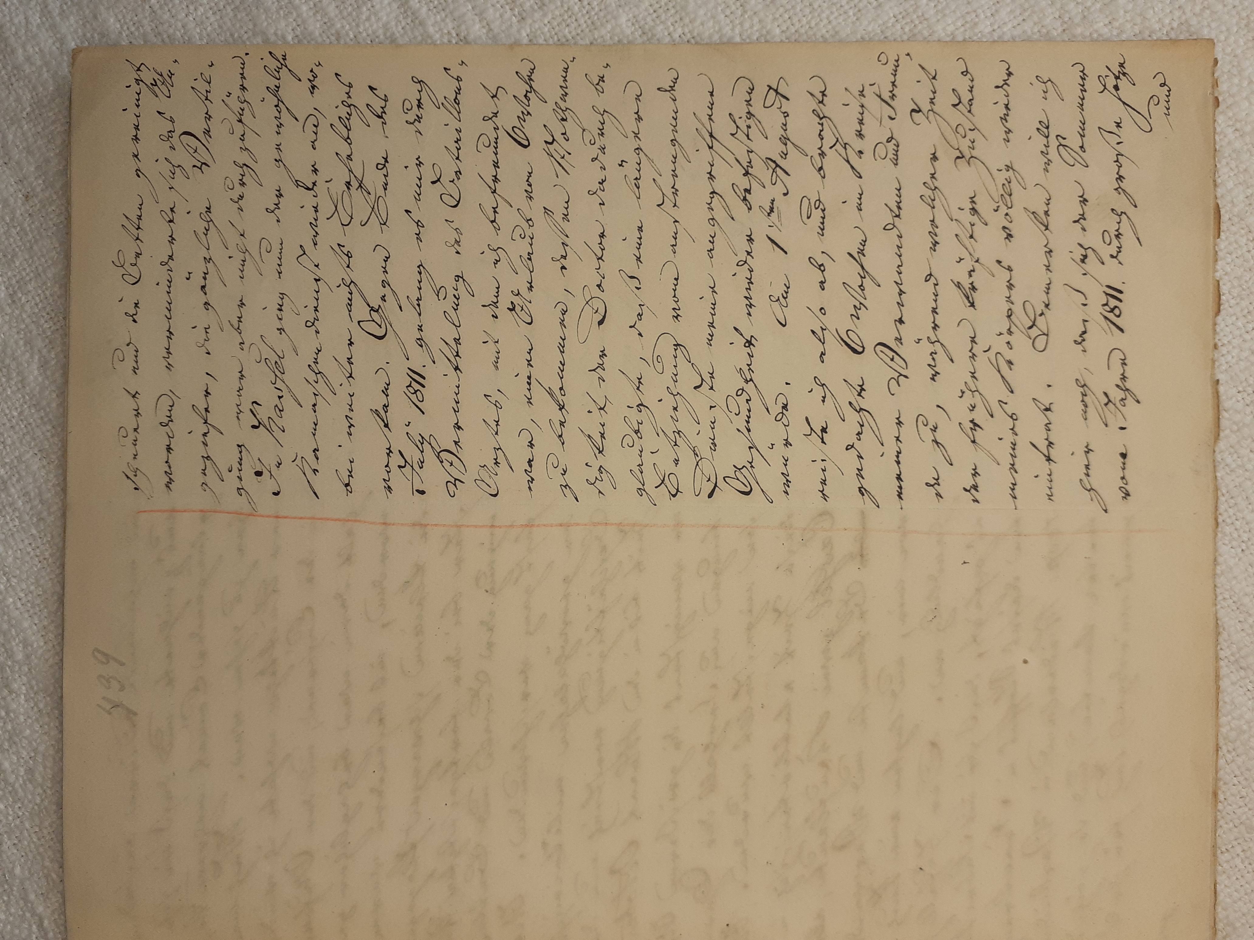 mit herein zu fahren. Der Knecht mähte und wir nahmen hinter ihm das Futter auf. Unvorsichtig kam ich dem Mäher zu nah und er hieb mir mit der Sense die Wade des rechten Beins bis auf den Knochen durch, so daß man die Sense auf dem Knochen durch streifen hörte. Freilich stimmte ich hierbei ein Klagelied an, indessen faßte mich das Mädchen und trug mich nach Hause, wobei viel Blut verloren ging. Meine Mutter, die allerlei Hausmittel anzuwenden verstand, auch immer einen kleinen Vorrath von Pflastern etc. bereit hielt, reinigte die Wunde, stillte das Blut und verband solche mit Scharpie und Degestin4. Später verband ich sie selbst und der Schaden würde sehr bald geheilt worden seyn, wenn ich mehr darauf Bedacht gewesen wäre, Stöße, Schläge etc. davon abzuwenden. Das Merkmal von der Wunde ist